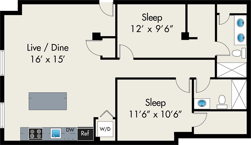 Modelo de apartamento: A9 - 1201 Dormitorio, 1 Baño, 998 sq ftDisponible February 28, 2026![]()