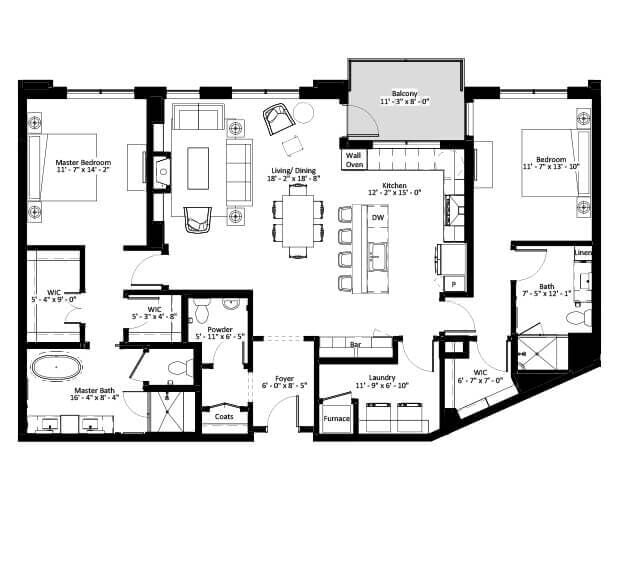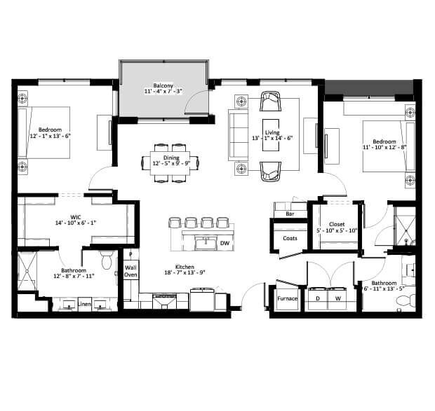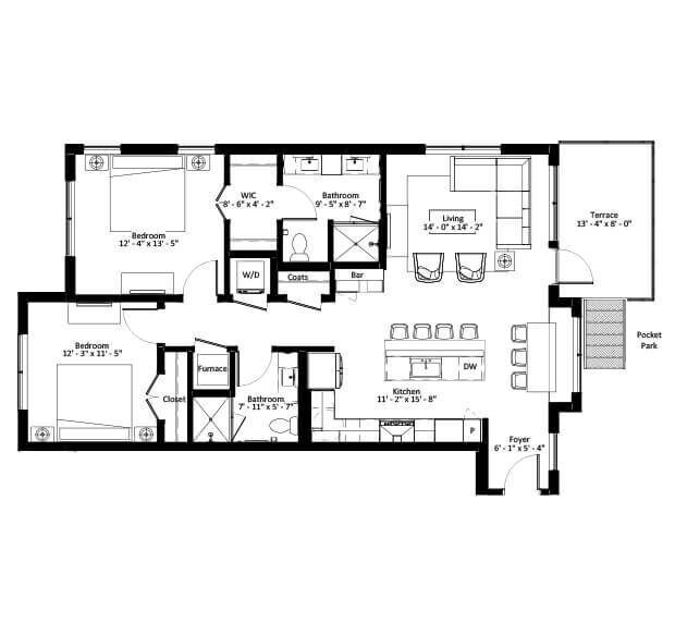 Modelo de apartamento: A2$1,1111 Dormitorio, 1 Baño, 755 sq ftNo Disponible![]()