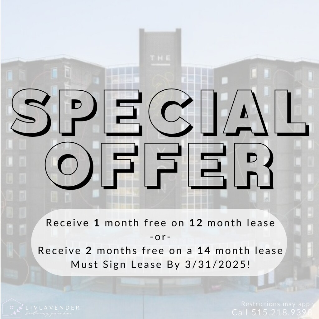 La promoción que hay actualmente para la renta en The Lyon es: 1 Month Free~~One month free when you sign a 12 month lease! Must sign by 4/15/2026!