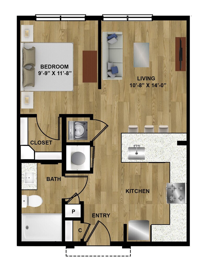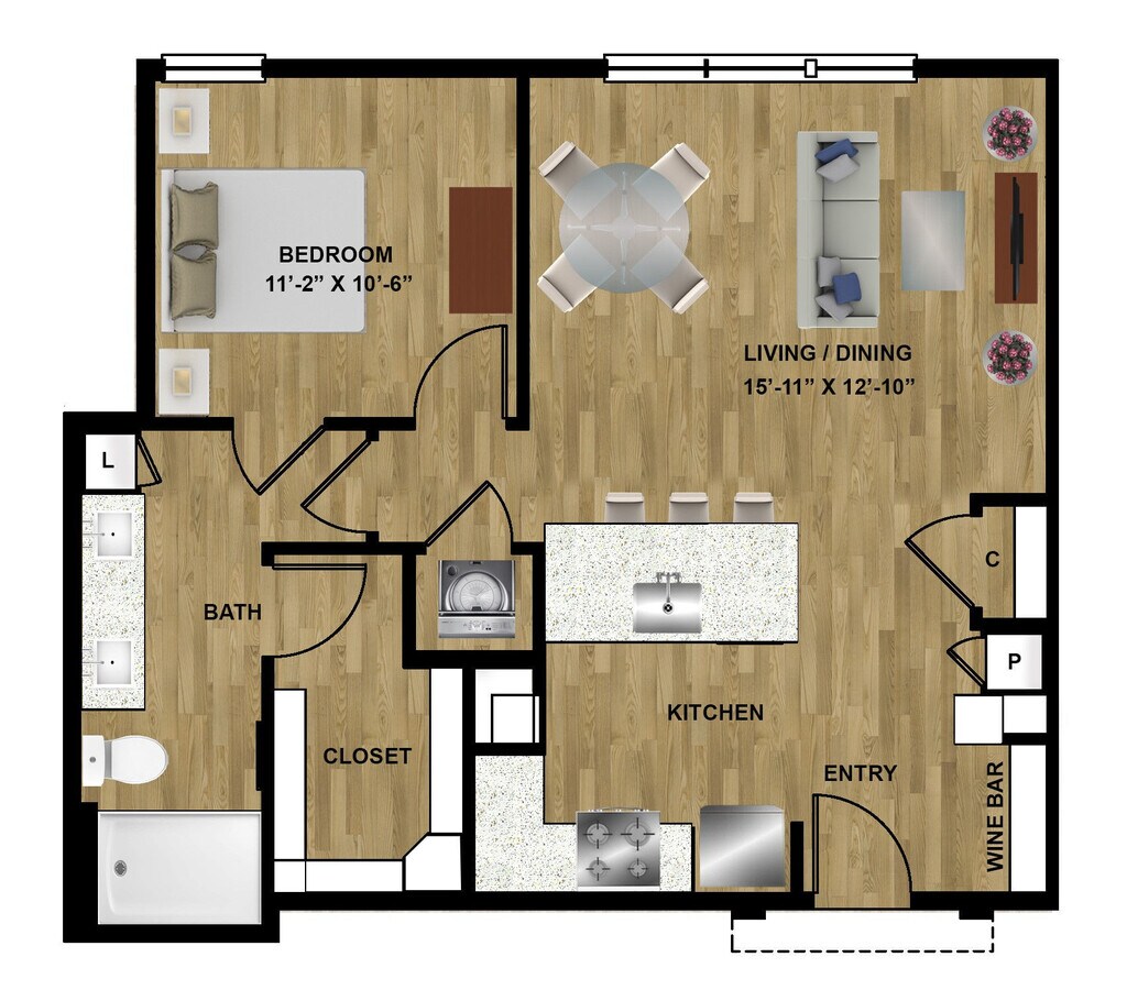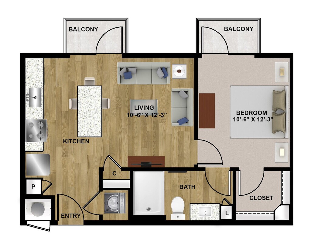 1 Dormitorio, 1 Baño, 549 pies²Disponible AhoraGalería del Modelo