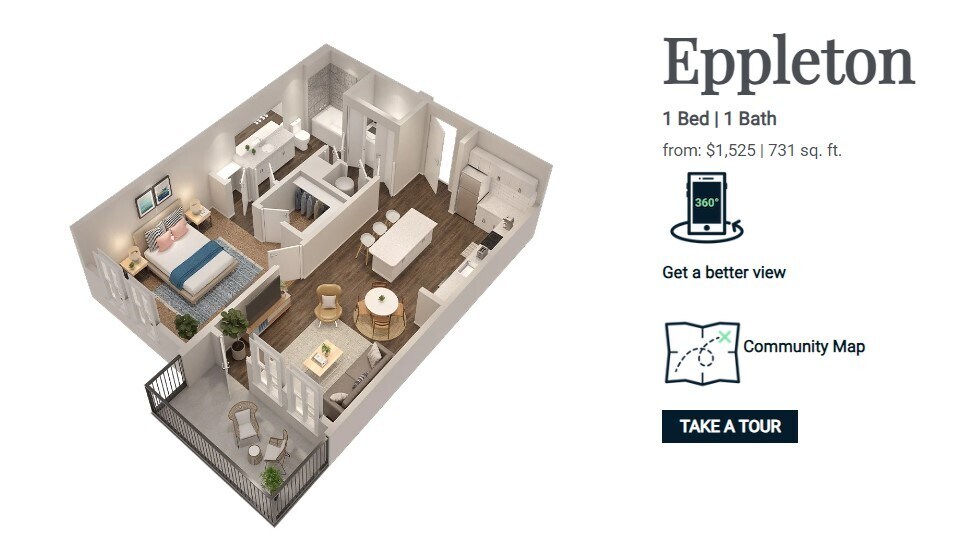 Modelo de apartamento: EppletonDesde $1,5701 Dormitorio, 1 Baño, 731 sq ftDisponible Ahora![]()