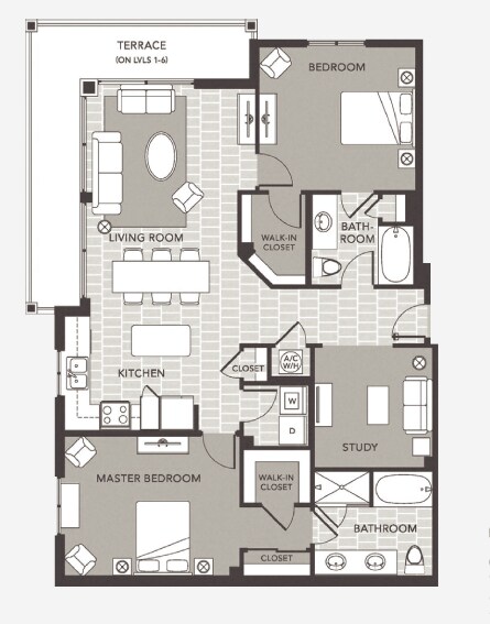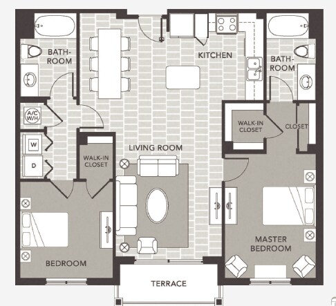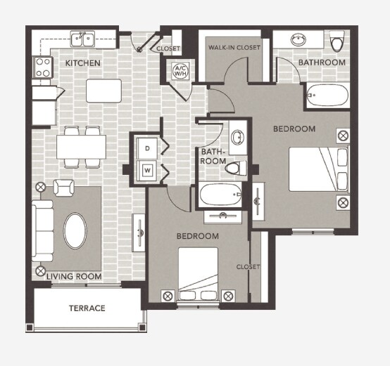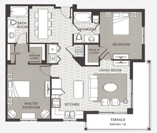 Modelo de apartamento: A2Desde $2,5191 Dormitorio, 1 Baño, 770 sq ftDisponible Ahora![]()