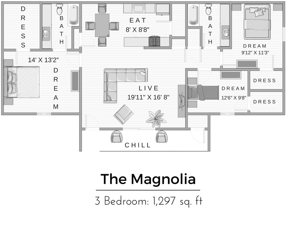 Modelo de apartamento: Magnolia$9903 Dormitorios, 2 Baños, 1297 sq ftDisponible AhoraPlanosFotos![]()