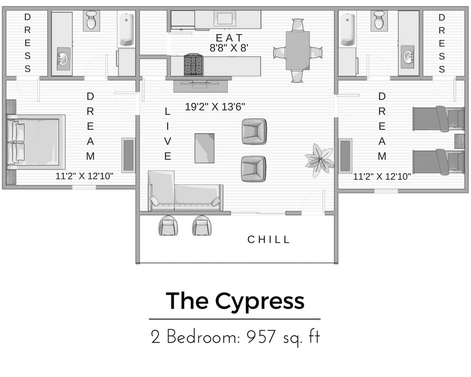 Modelo de apartamento: CypressLlame para Precios2 Dormitorios, 2 Baños, 957 sq ftPlanosFotos![]()