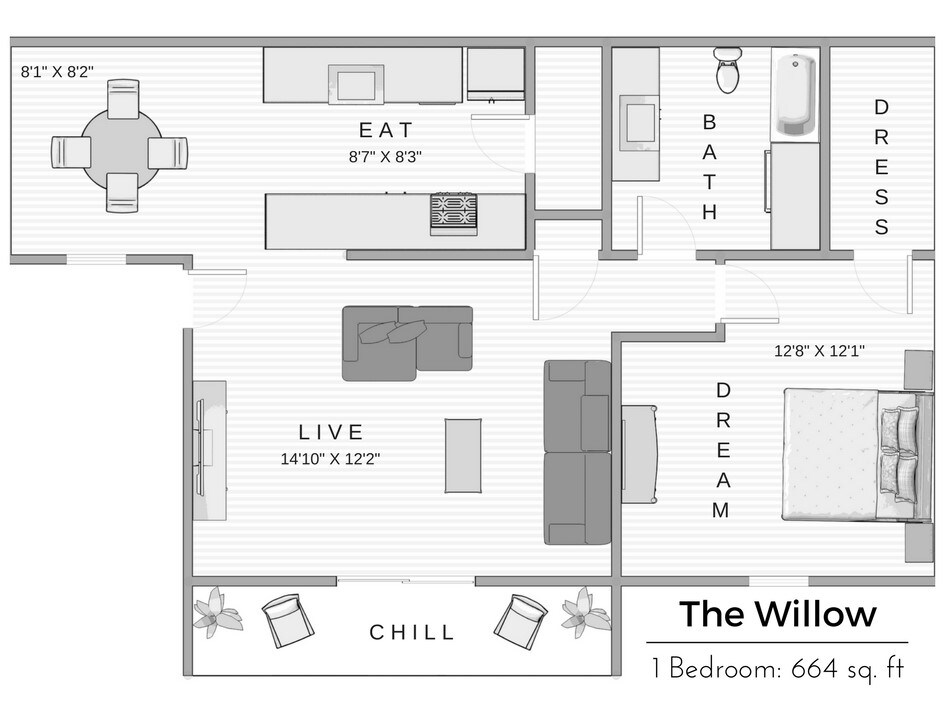 Modelo de apartamento: WillowLlame para Precios1 Dormitorio, 1 Baño, 664 sq ftNo DisponiblePlanosFotos![]()
