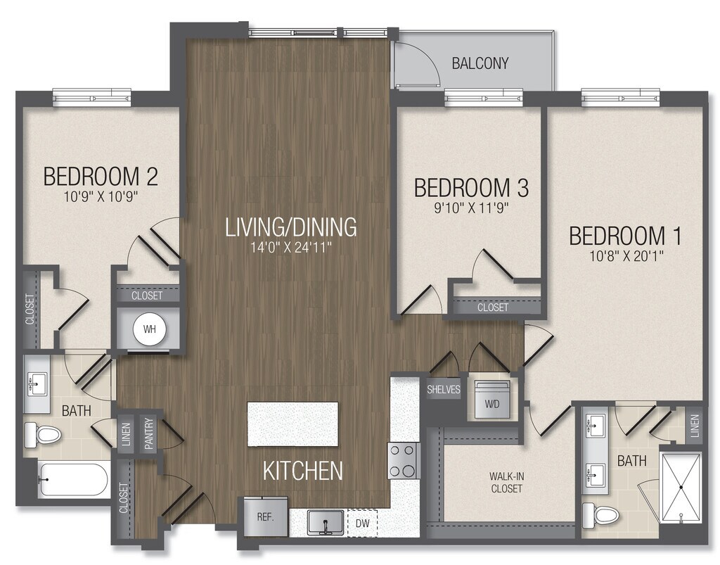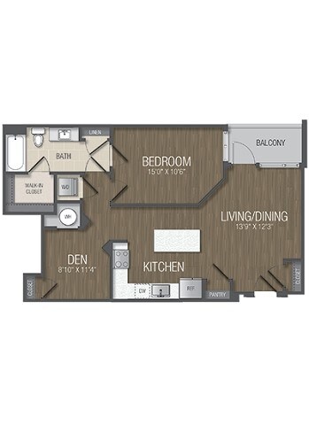 Modelo de apartamento: A1Desde $2,1431 Dormitorio, 1 Baño, 825-827 sq ftDisponible Ahora![]()