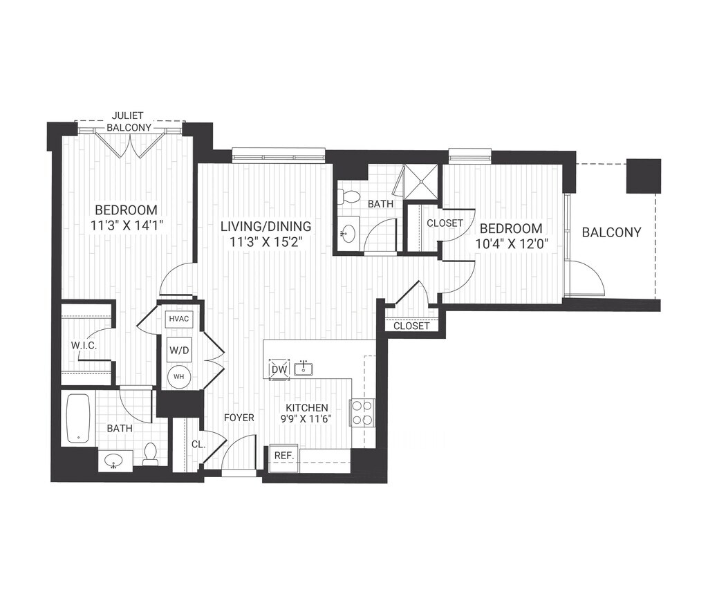 B08 - Plano Unidad de apartamento: 1-305Modelo de apartamento: B082 Dormitorios, 2 Baños, 1139 sq ftDisponible April 30, 2026Plano: B02