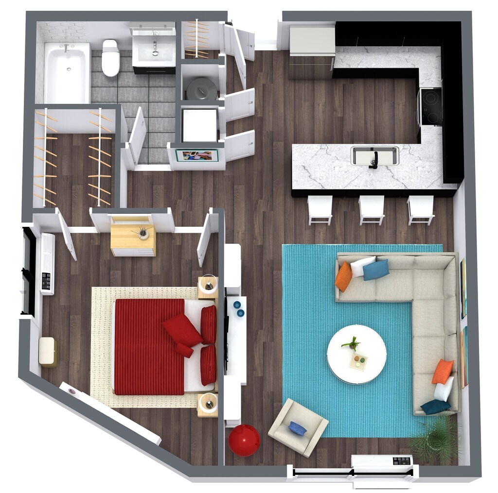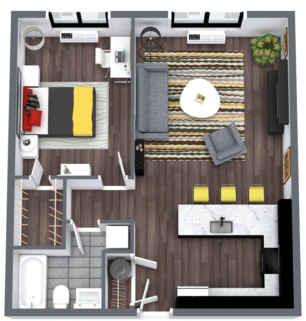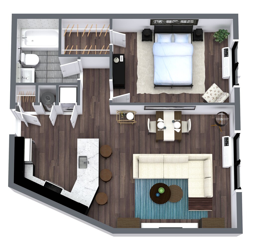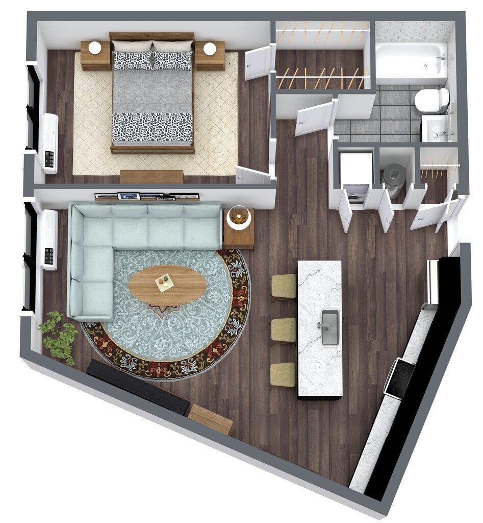 1 Bedroom Corner - Plano 3 Unidad de apartamento: 201Modelo de apartamento: 1 Bedroom Corner$1,3951 Dormitorio, 1 Baño, 670 sq ftDisponible Ahora![]()