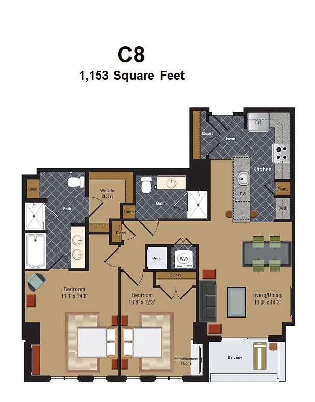 1 Dormitorio, 1 Baño, 603-763 pies²Disponible AhoraGalería del Modelo