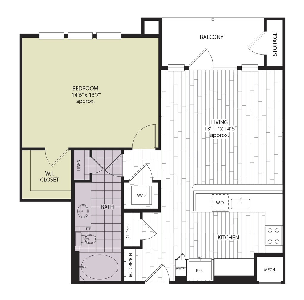 Modelo de apartamento: A1aDesde $1,4261 Dormitorio, 1 Baño, 739 sq ftDisponible Ahora![]()
