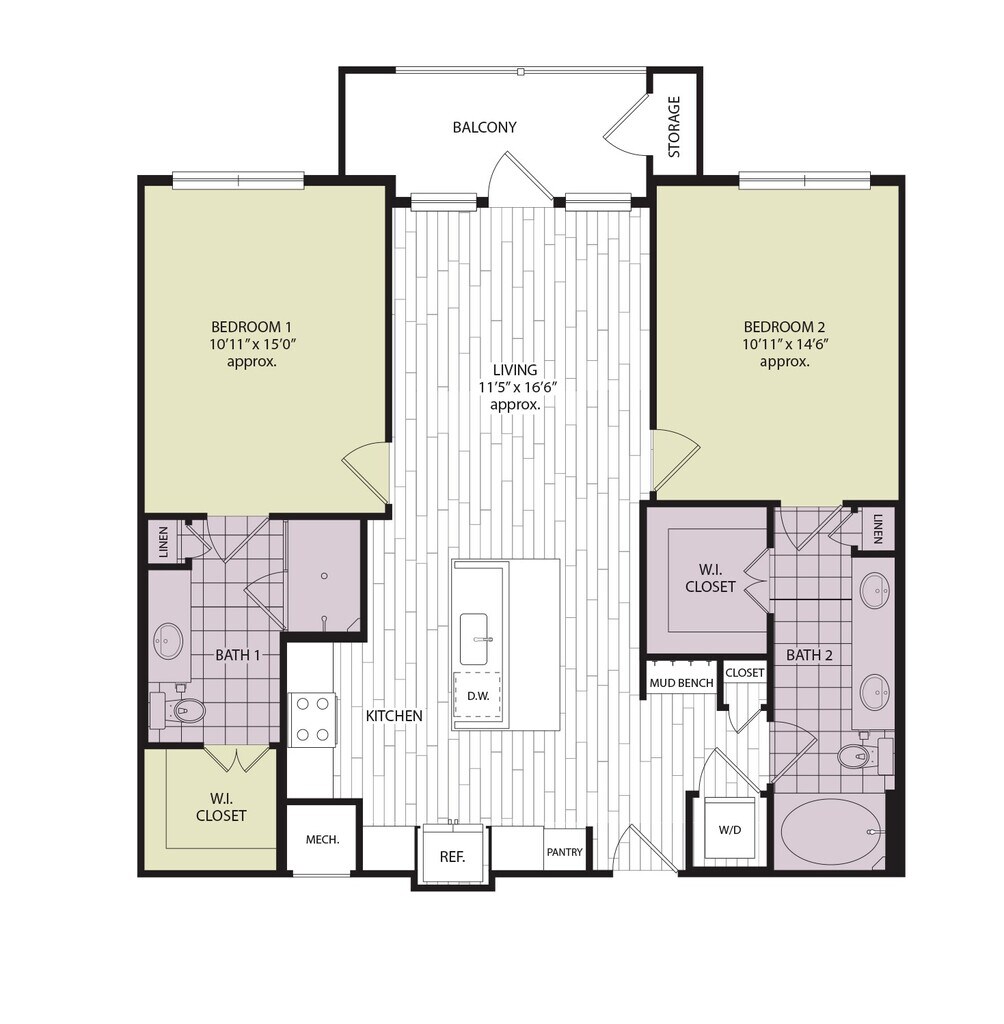 Modelo de apartamento: A2Desde $1,1691 Dormitorio, 1 Baño, 738 sq ftDisponible Ahora![]()