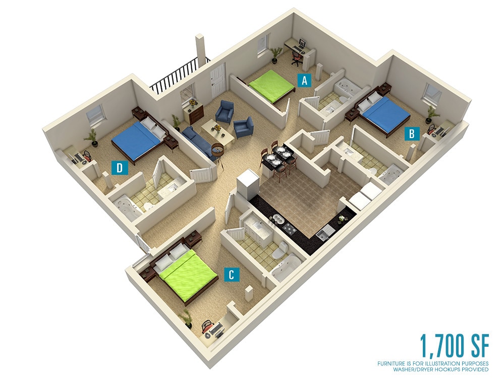 Modelo de apartamento: 4 Bed - 4 Bath$1,5004 Dormitorios, 4 Baños, 1700 sq ftNo Disponible4 Bed - 4 Bath - Plano 1
