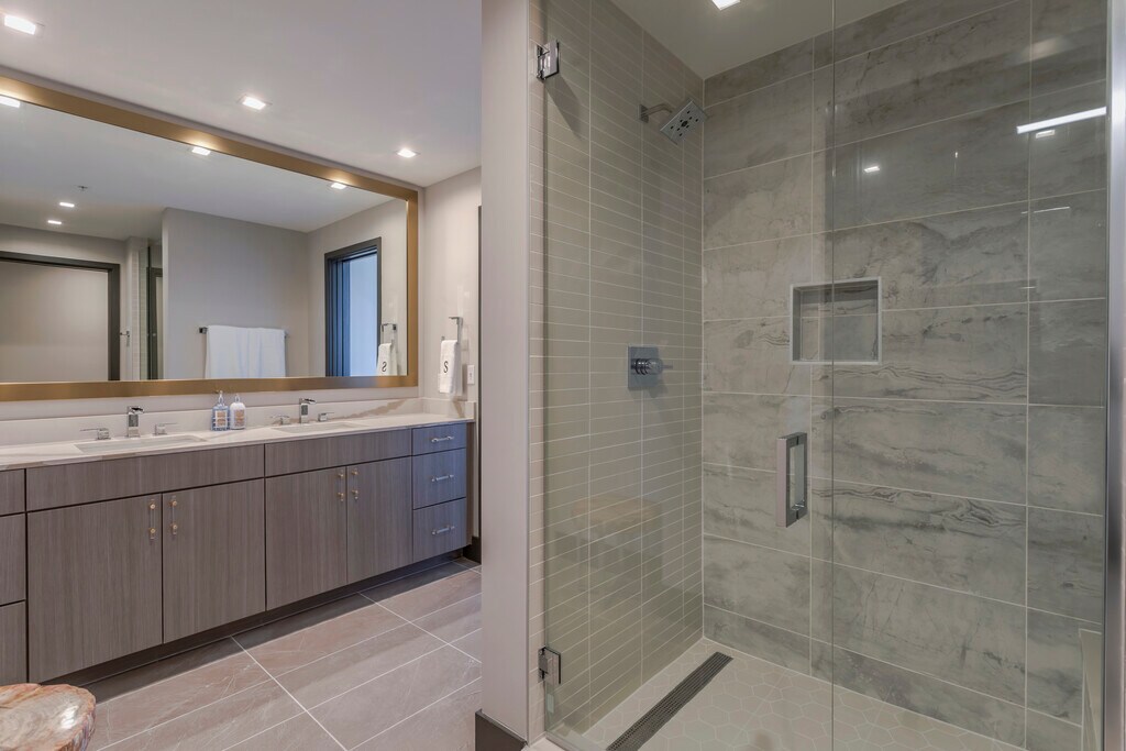 - Duchas a ras de suelo con bancos integrados y mampara de cristal