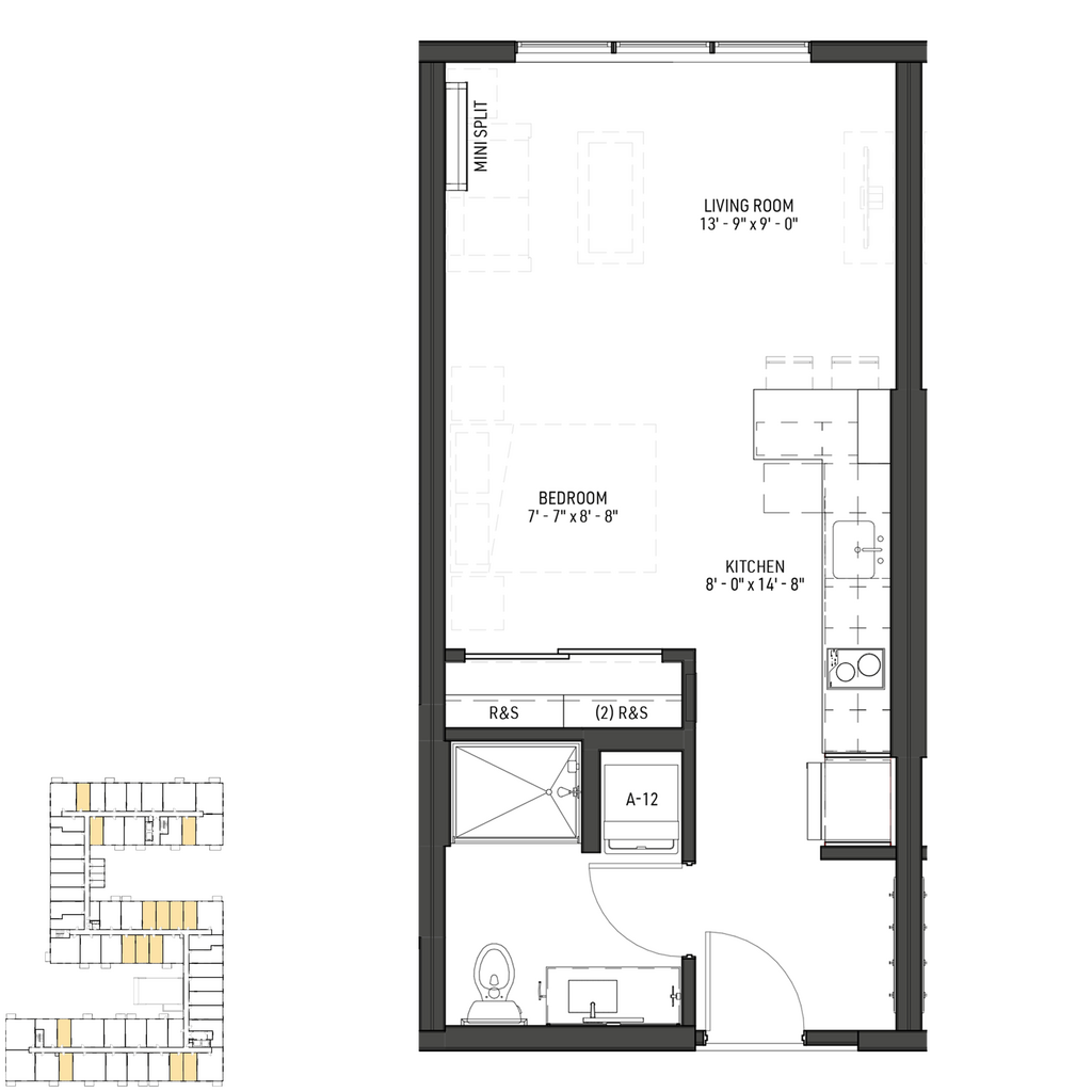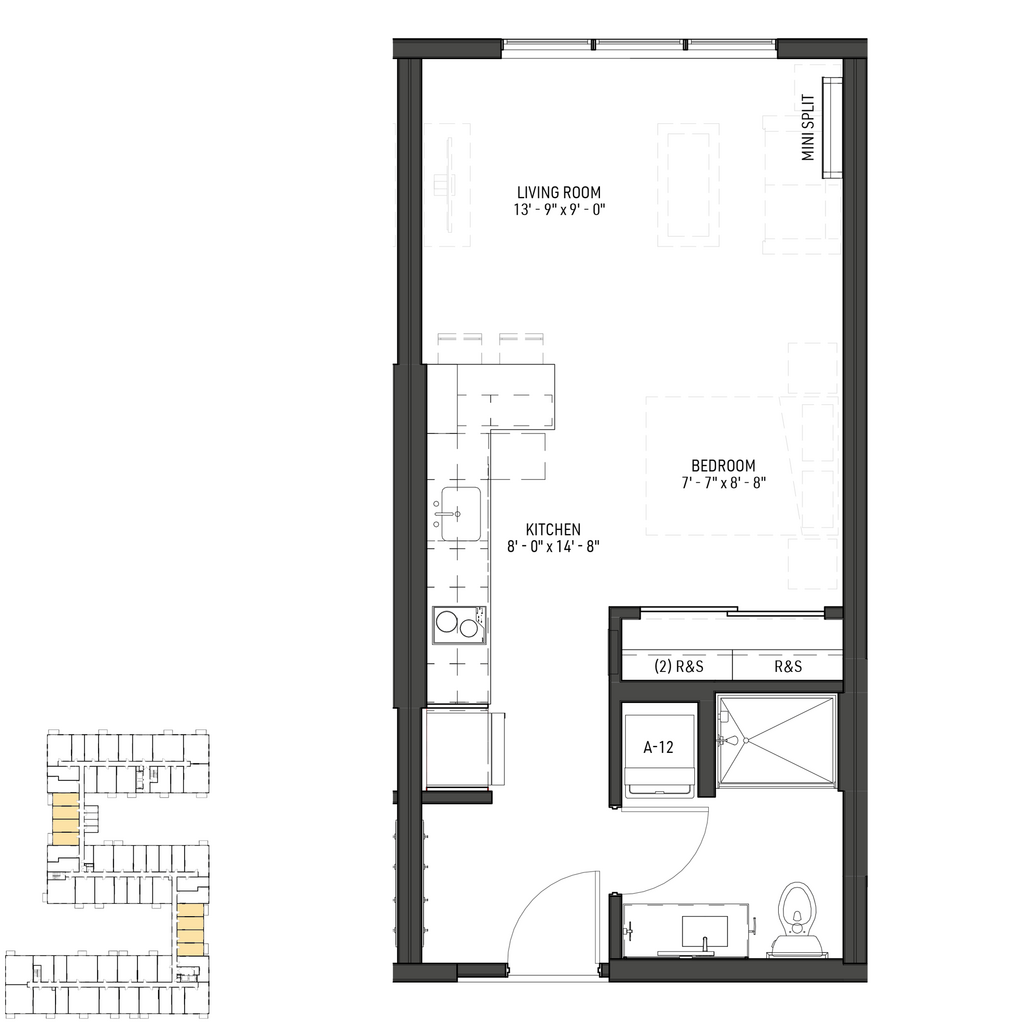 Modelo de apartamento: NicolletDesde $1,450Estudio, 1 Baño, 414 sq ftDisponible AhoraNicollet - Plano 1 Unidad de apartamento: 554Modelo de apartamento: Nicollet$1,450Estudio, 1 Baño, 414 sq ftDisponible AhoraUnidad: 554 - Imagen 1 Snelling - 60% AMI