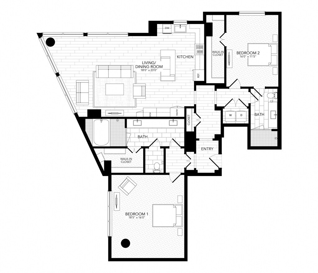 Modelo de apartamento: A5Desde $2,7341 Dormitorio, 1 Baño, 813 sq ftDisponible Ahora![]()