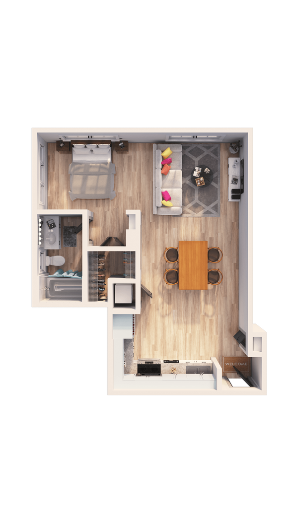 Modelo de apartamento: A1ELlame para Precios1 Dormitorio, 1 Baño, 776 sq ftDisponible May 10, 2026![]()