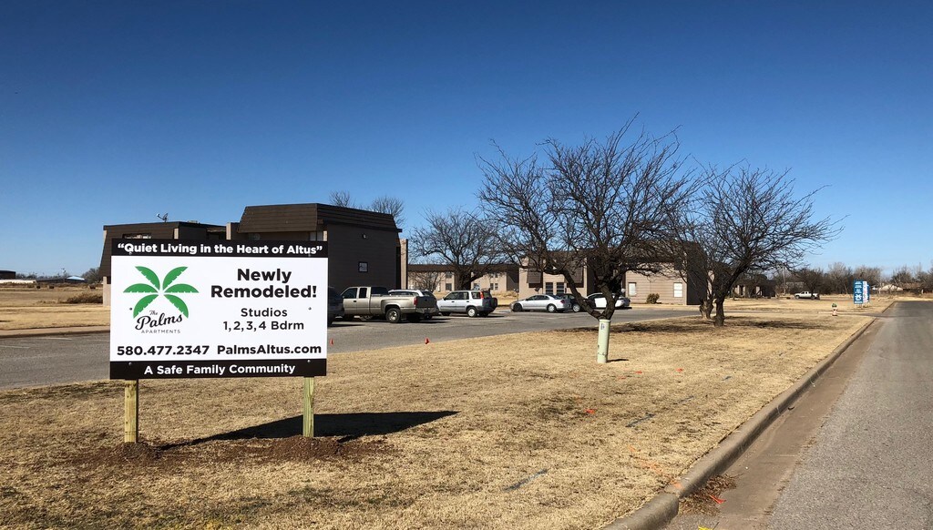 The Palms Apartments es una propiedad familiar y amigable ubicado a solo 1 milla de la entrada a ALTUS AFB. Tenemos ofertas especiales de alquiler para militares activos. Más de 5 acres de césped verde te esperan a ti y a tu familia en The Palms Apartments. Lavandería en el lugar, área de juegos infantiles y espacio para deambular son el sello distintivo de The Palms. Nos encantaría que completar una solicitud en el sitio web. Puedes ir a www.PalmsAltus.com! Completa la aplicación, y podemos llevarlo a establecer pronto para vivir en el mejor complejo de apartamentos de calidad en Altus. No dudes en llamarnos para programar una cita para ver los apartamentos disponibles. Esperamos que decidas ser parte de la familia de The Palms Apartments. LLAMA HOY MISMO A 580-477-2347
