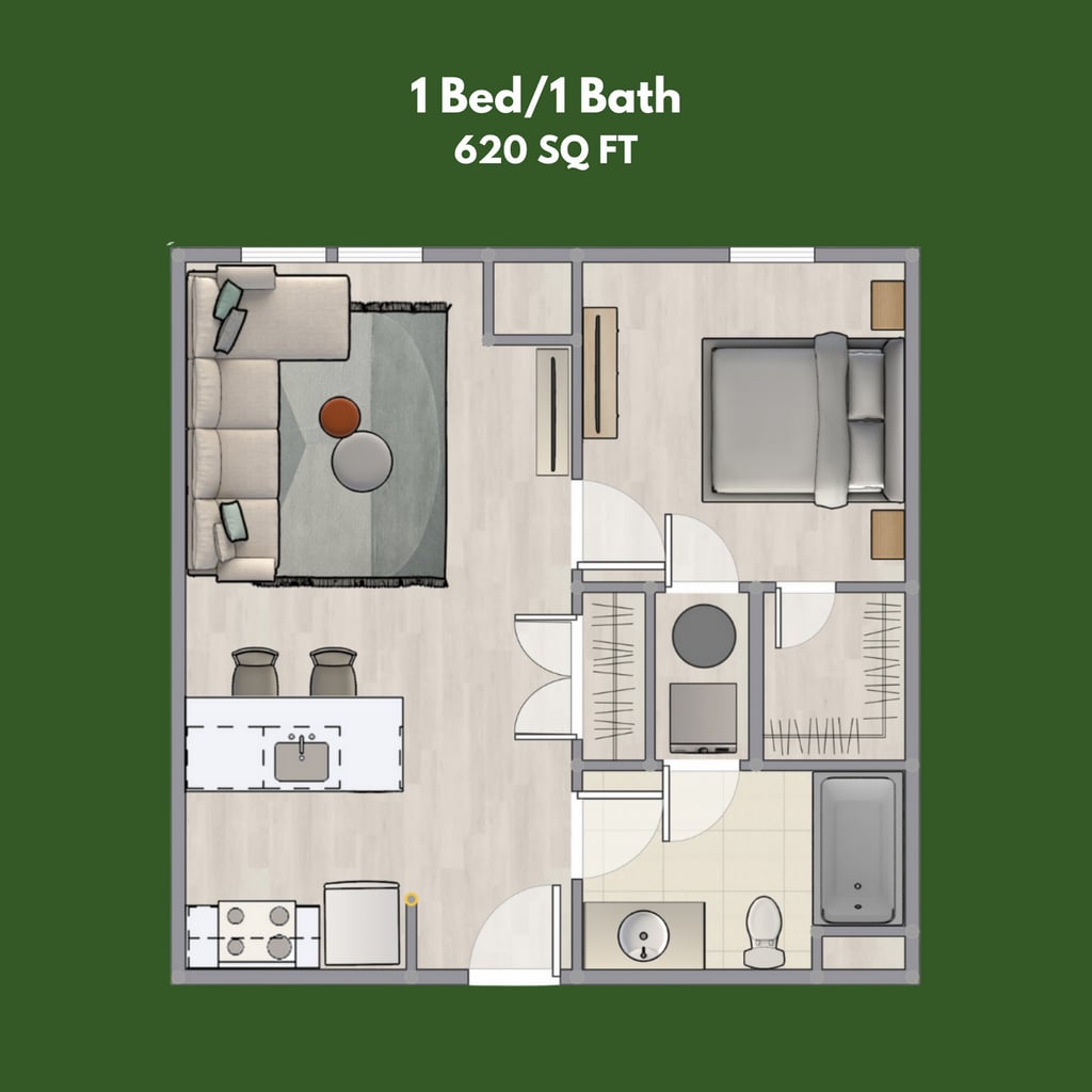 1 Dormitorio, 1 Baño, 620 pies²Precio Mensual TotalDisponible AhoraGalería del Modelo