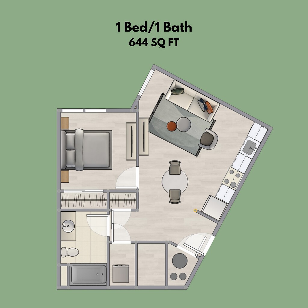 1 Dormitorio, 1 Baño, 644 pies²Precio Mensual TotalDisponible AhoraGalería del Modelo