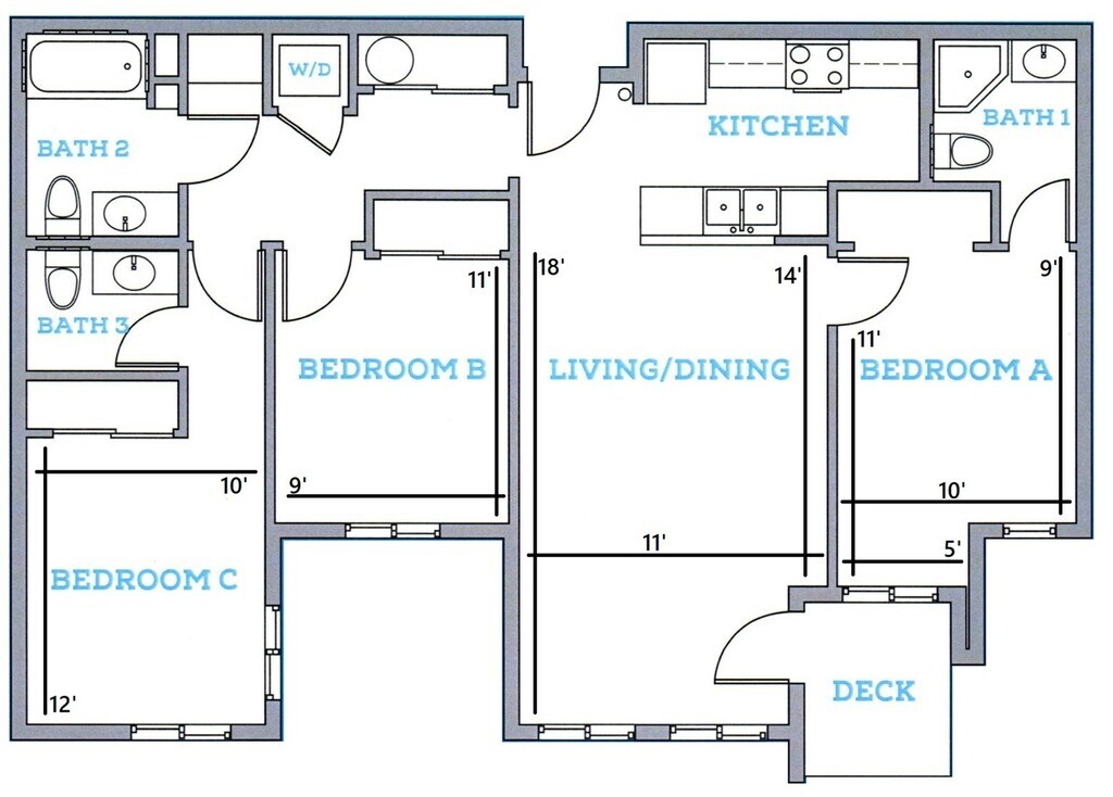 3BR/3BA - A - Plano 8 Unidad de apartamento: 225Modelo de apartamento: 3BR/3BA - A3 Dormitorios, 3 Baños, 1220 sq ftDisponible Ahora![]()