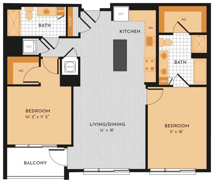 Modelo de apartamento: A1Desde $2,3931 Dormitorio, 1 Baño, 767-789 sq ftDisponible Ahora![]()