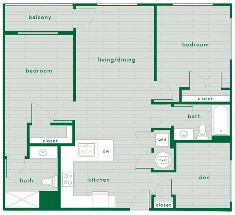 Modelo de apartamento: 1 Bed 1 Bath Flex - 734 Sq. Ft.1 Dormitorio, 1 Baño, 734-742 sq ftDisponible Ahora![]()