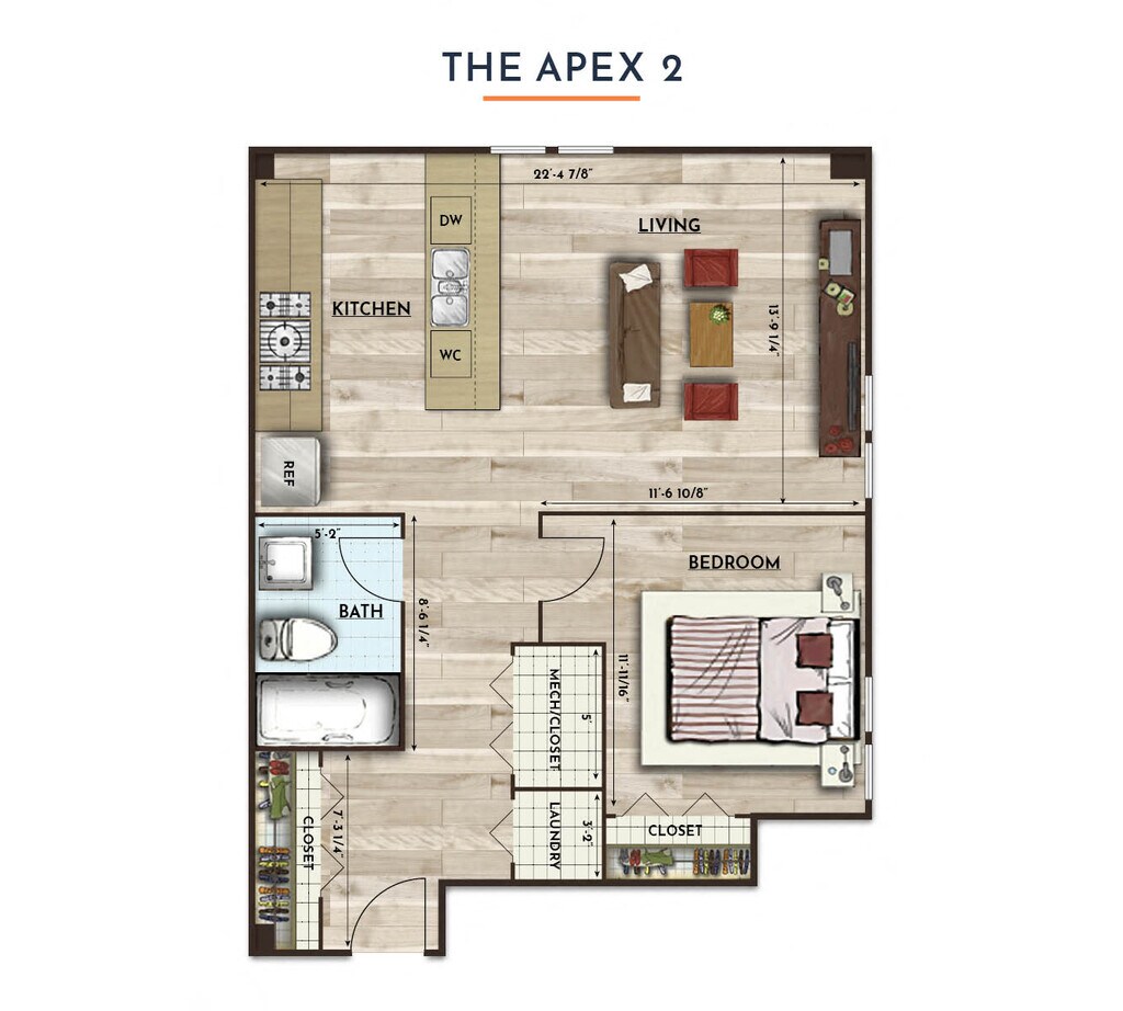 The Apex 2 - Plano 1 Unidad de apartamento: 507EEModelo de apartamento: The Apex 21 Dormitorio, 1 Baño, 655 sq ftDisponible March 2, 2026![]()