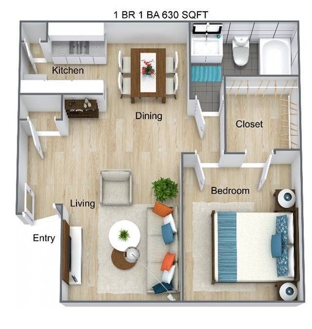 Modelo de apartamento: A1Desde $6611 Dormitorio, 1 Baño, 565 sq ftDisponible Ahora![]()