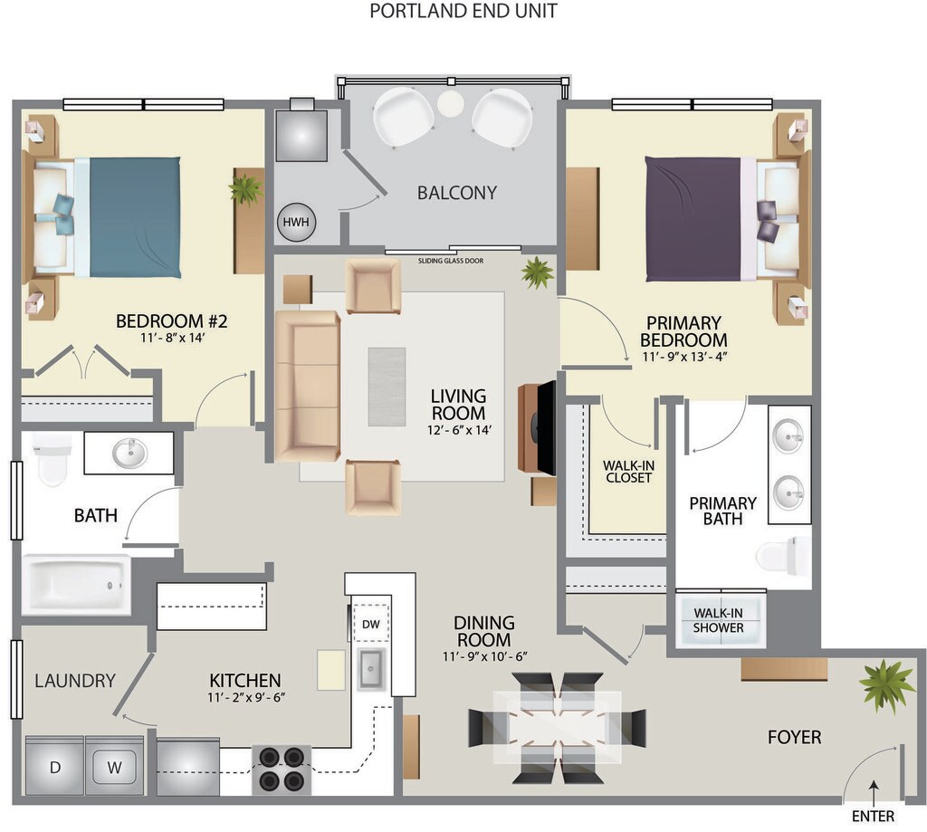 Vancouver End - Plano 1 Unidad de apartamento: 912Modelo de apartamento: Vancouver End$3,5602 Dormitorios, 2 Baños, 1356 sq ftDisponible AhoraPortland