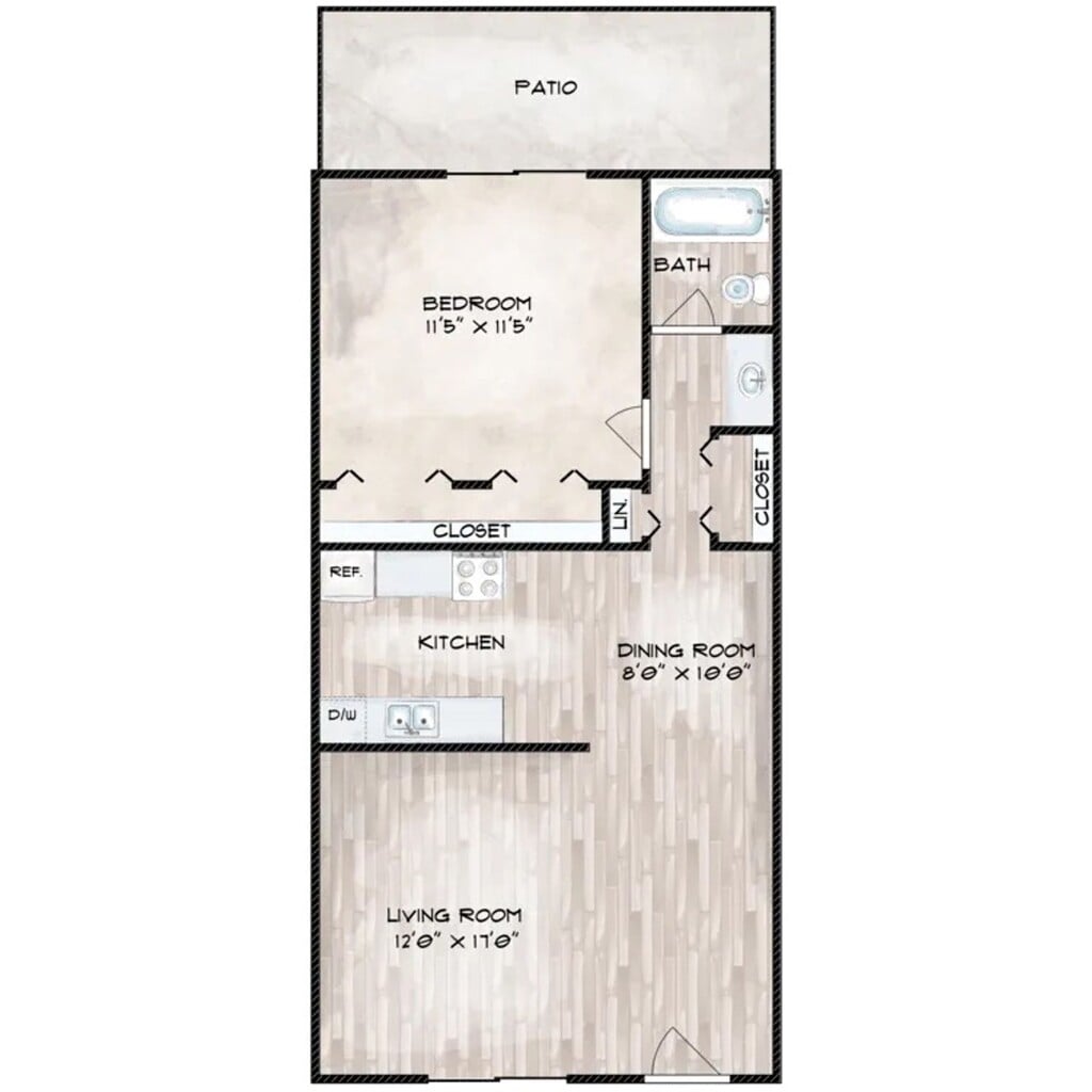 Modelo de apartamento: A1$8451 Dormitorio, 1 Baño, 700 sq ftDisponible February 10, 2026PlanosFotos![]()