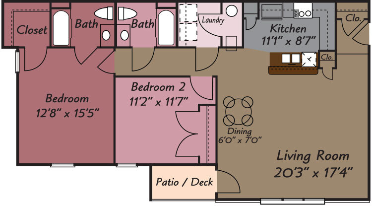 Modelo de apartamento: Two BedroomDesde $1,4492 Dormitorios, 2 Baños, 1182 sq ftDisponible AhoraTwo Bedroom - Plano 1 3 Dormitorios