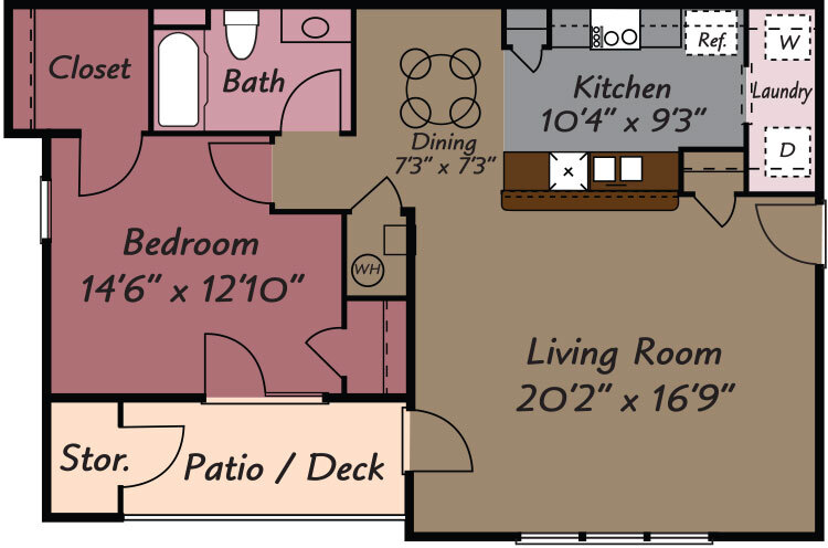 Modelo de apartamento: One Bedroom$1,2991 Dormitorio, 1 Baño, 905 sq ftDisponible AhoraOne Bedroom - Plano 1 2 Dormitorios