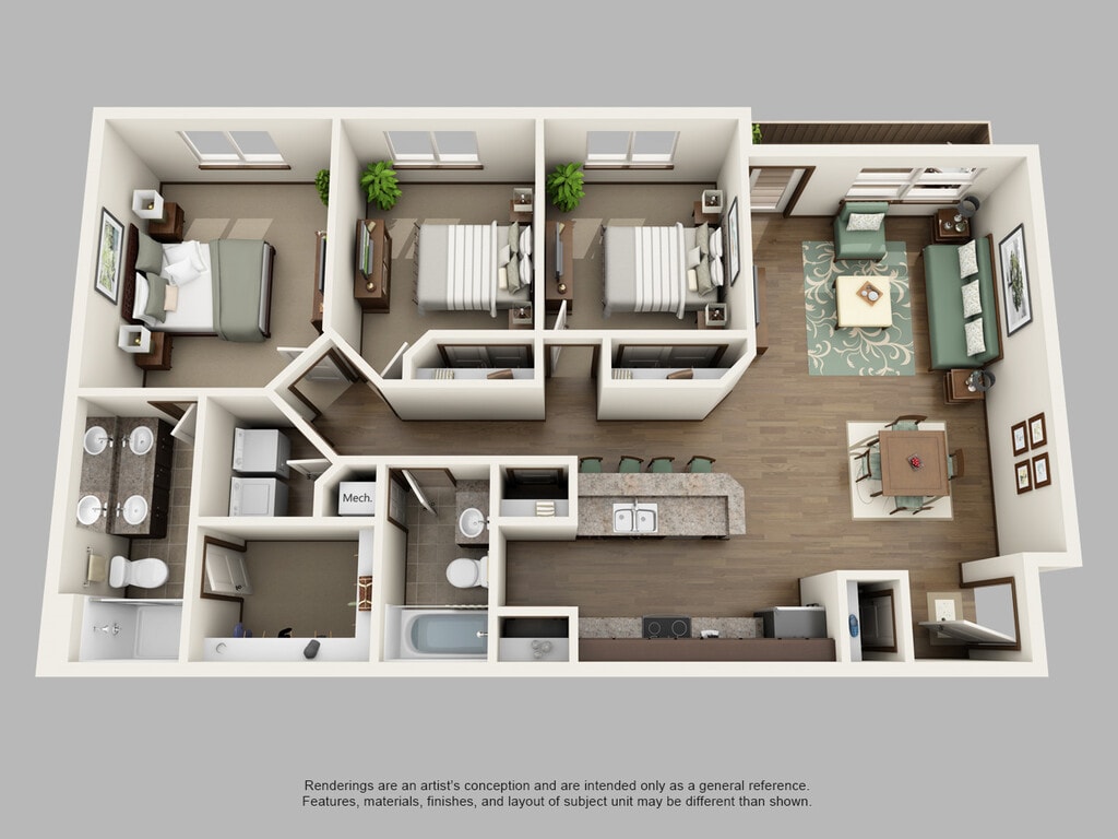 3 Dormitorios, 2 Baños, 1228 pies²Galería del Modelo