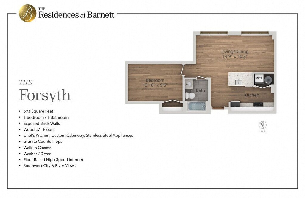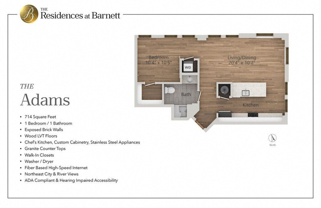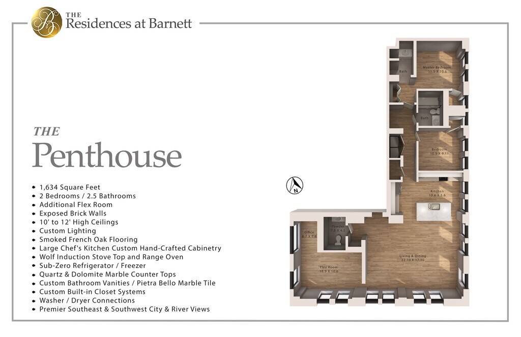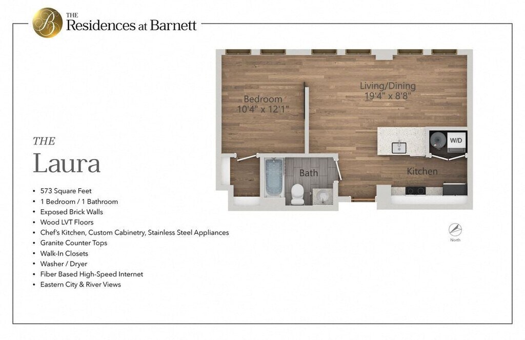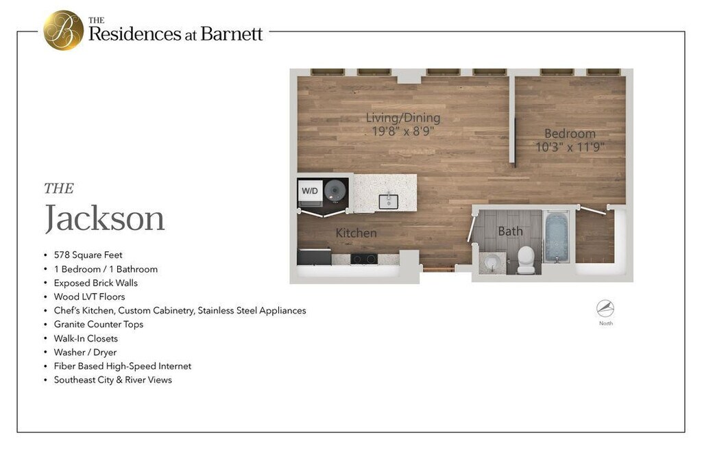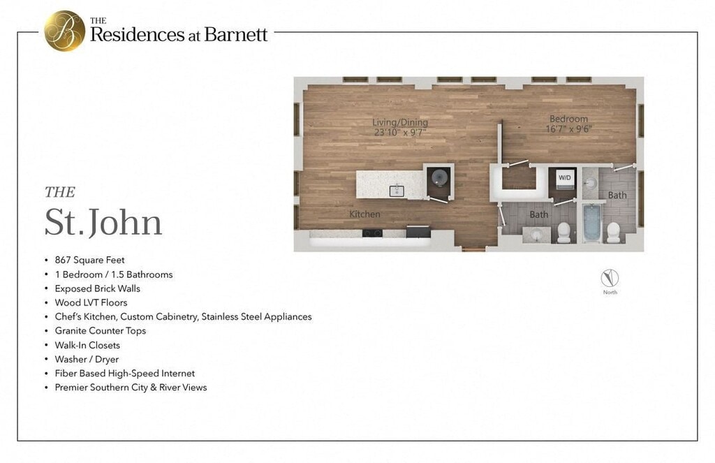 El histórico edificio Barnett renace en 2019 luego de dos años de conservación y de la reinvención de uno de las principales direcciones del centro de la ciudad de Jacksonville. La torre de 18 pisos ahora cuenta con 107 apartamentos residenciales estilo loft, con vista al centro de Jacksonville y al St. Johns River. Los catorce exclusivos planos de planta ofrecen lo último en tecnología y acabados excelentes, que incluyen paredes de ladrillo a la vista, cocinas de chef con gabinetes personalizados, electrodomésticos de acero inoxidable, encimeras de granito y pisos de madera LVT. Todos los apartamentos incluyen acceso a Internet de alta velocidad y estacionamiento privado seguro. Disfruta de esta increíble propiedad con las mejores vistas de la ciudad. No es solo historia, es tu hogar.