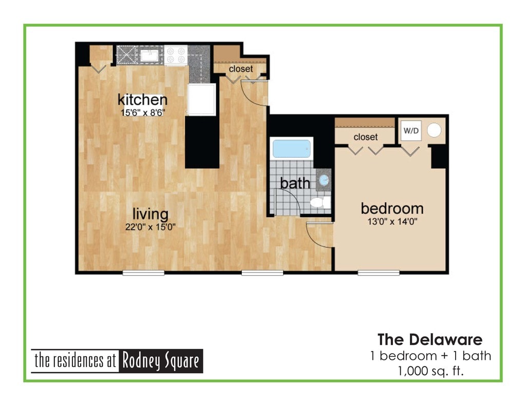 Delaware One Bedroom - Plano 1 Unidad de apartamento: 219Modelo de apartamento: Delaware One BedroomDesde $1,7121 Dormitorio, 1 Baño, 1000 sq ftDisponible December 26, 2025Penthouse 1bd/1bath