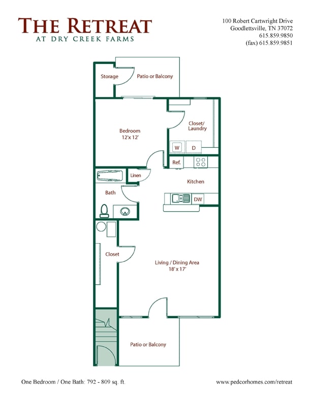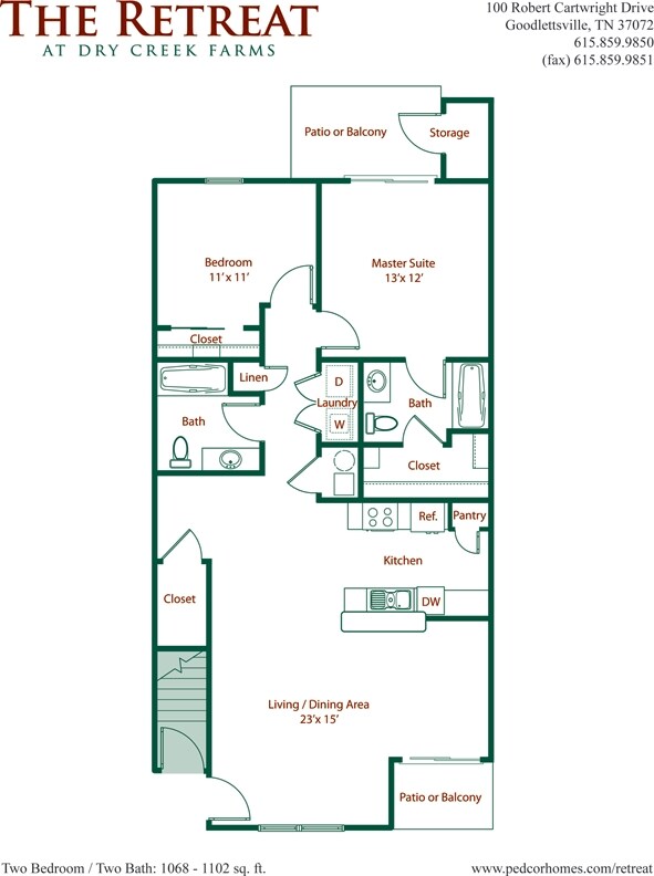 Select a one, two, or three bedroom apartment at The Retreat at Dry Creek Farms and create a living space that is uniquely you! From the large living spaces, fully equipped kitchens, washer/dryer connections, to the private patio/balcony, you'll love your personal retreat! Outside, you can relax poolside, recharge in the Fitness Center, take care of business in the Business Center, play on the playground or romp with your dog in the Pet Park. The Goodlettsville, TN location is perfect, just 30 minutes north of downtown Nashville via I-65. You'll be able to enjoy small town living while still being close to all the events and attractions of the Music City.