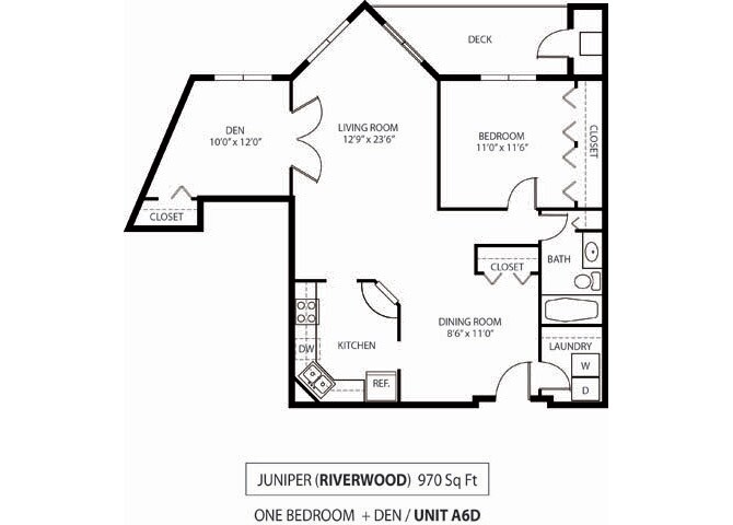 Modelo de apartamento: Juniper 1 DenLlame para Precios1 Dormitorio, 1 Baño, 970 sq ftNo DisponibleJuniper 1 Den - Plano 1 Hickory 1 Den