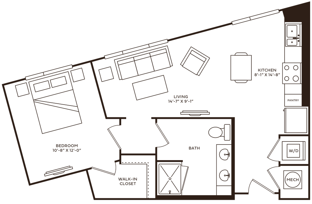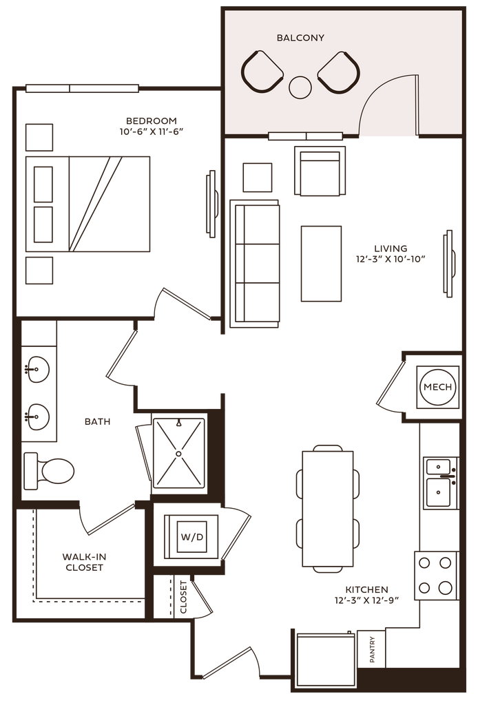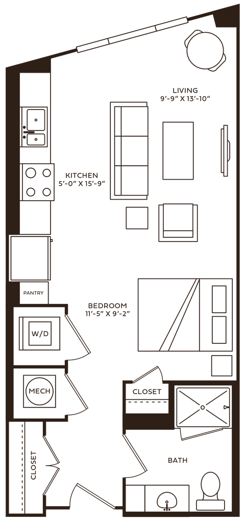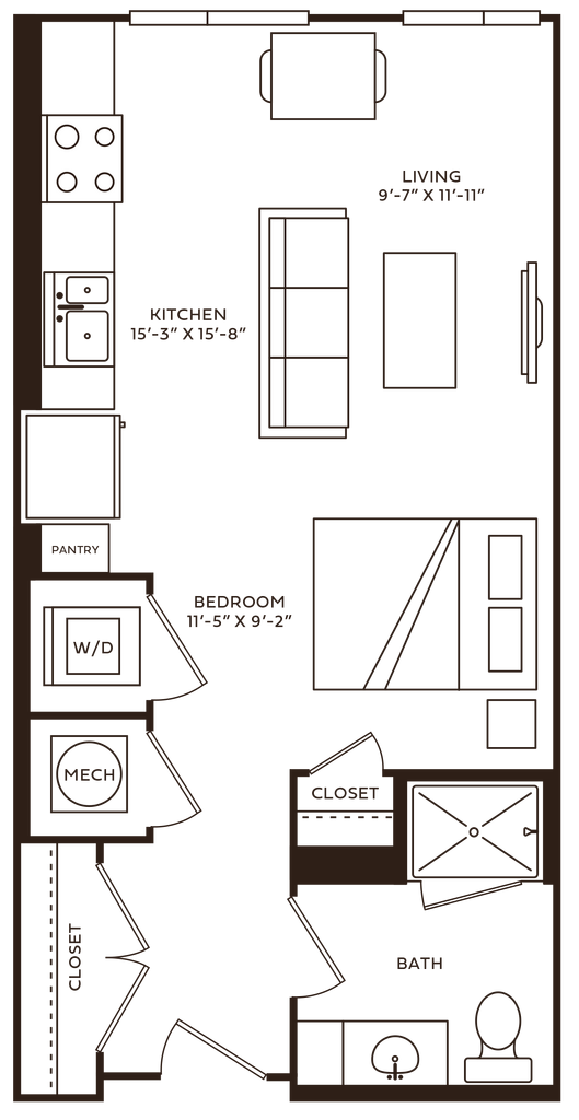 Unidad de apartamento: 723Modelo de apartamento: Blair$1,610Estudio, 1 Baño, 539 sq ftDisponible AhoraUnidad: 723 - Plano 1 Brooks