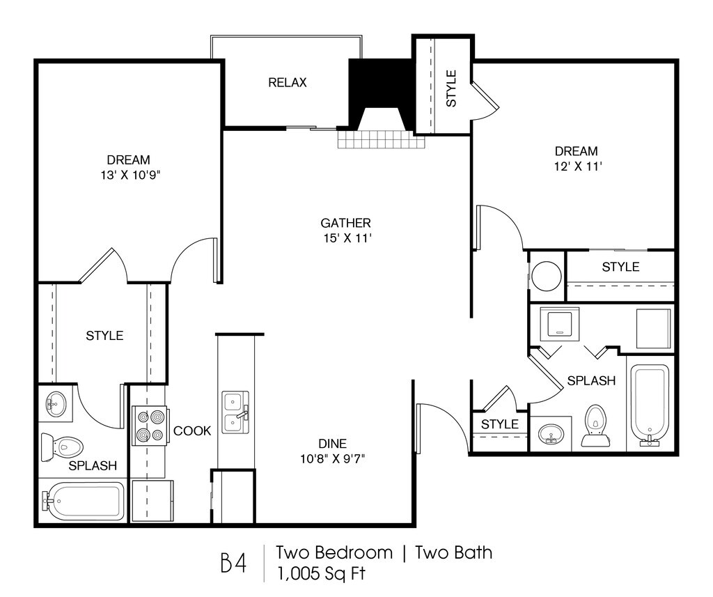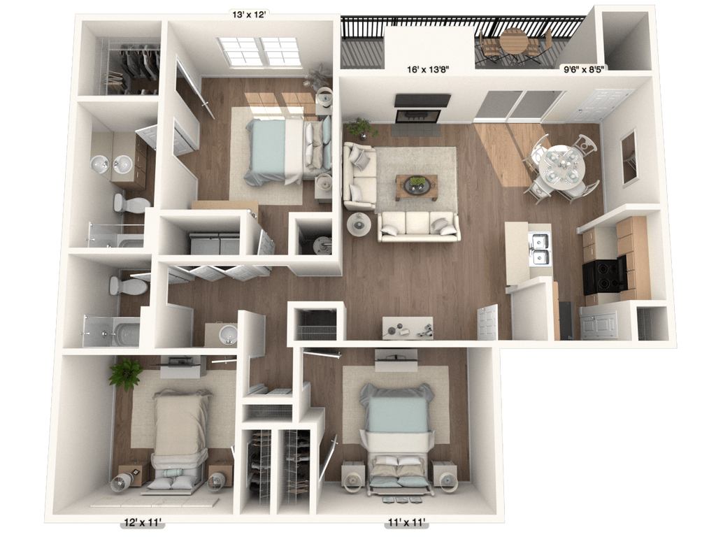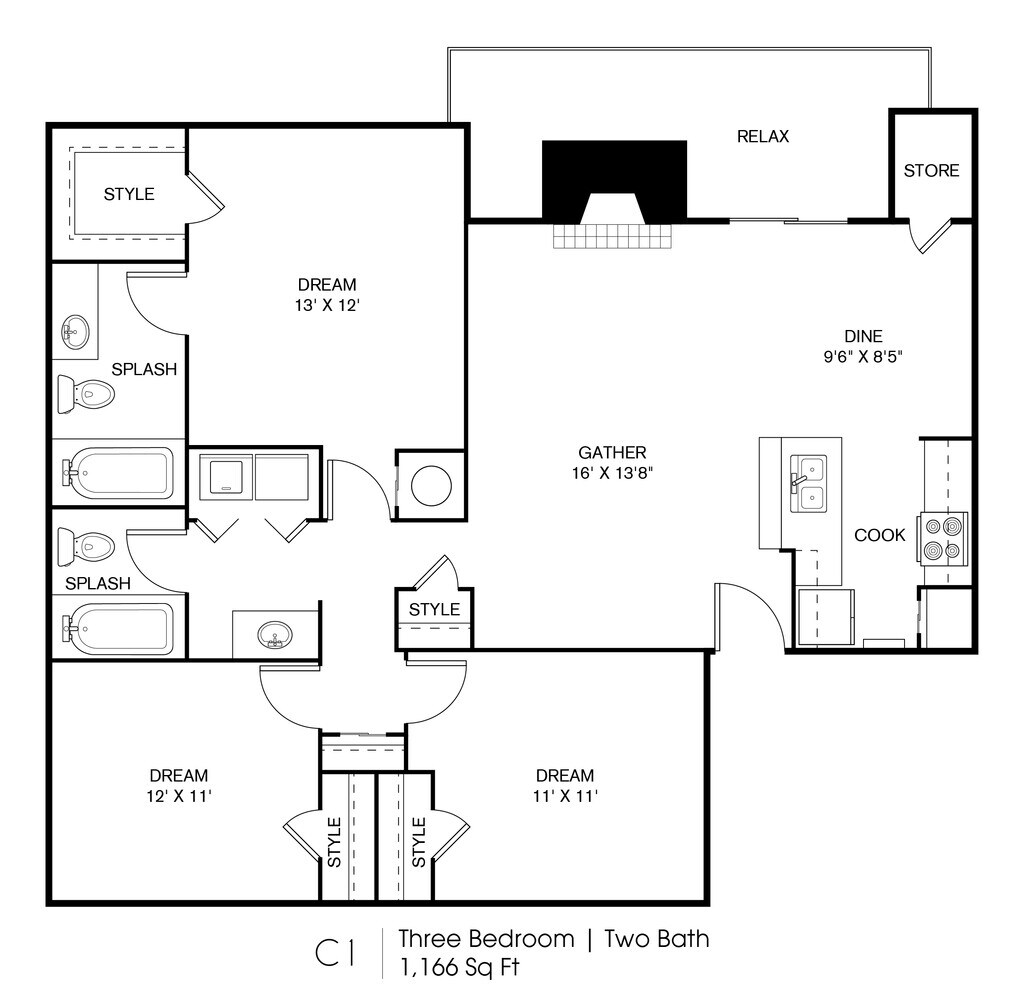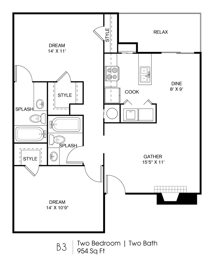 Modelo de apartamento: A3Llame para Precios1 Dormitorio, 1 Baño, 825 sq ftDisponible Ahora![]()