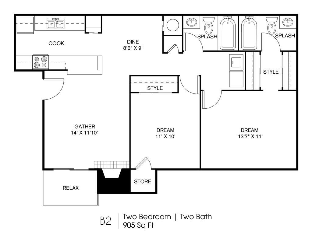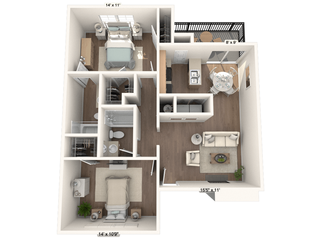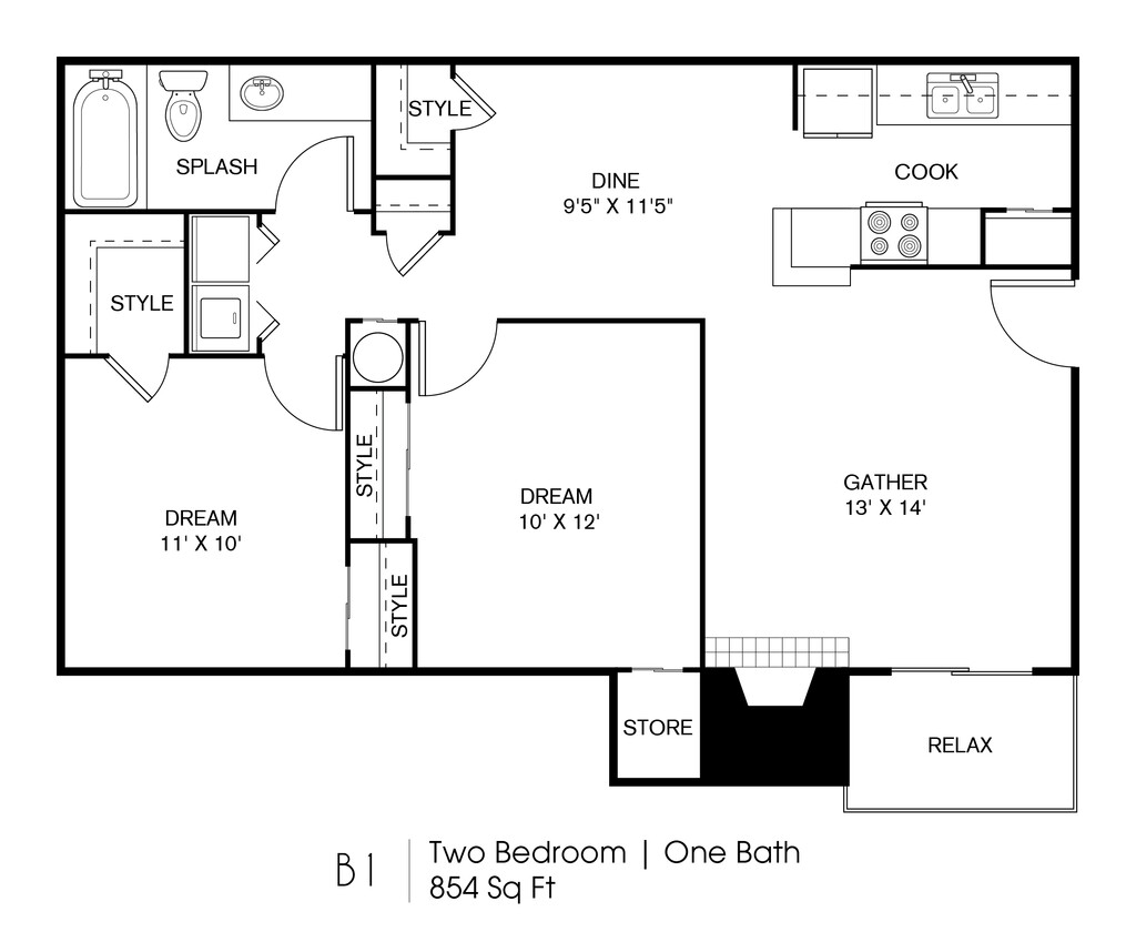 2 Dormitorios, 1 Baño, 854 pies²Disponible AhoraGalería del Modelo