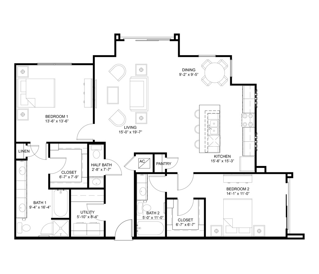 Modelo de apartamento: A1A1 Dormitorio, 1 Baño, 884 sq ftDisponible Ahora![]()