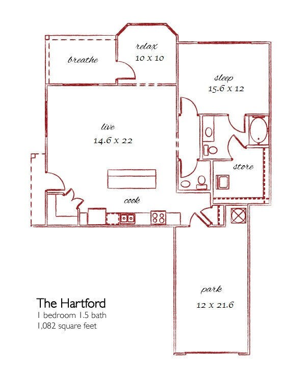 The Hartford - Plano 1 Unidad de apartamento: 12-100Modelo de apartamento: The Hartford$1,6641 Dormitorio, 1.5 Baños, 1082 sq ftDisponible AhoraThe Charleston