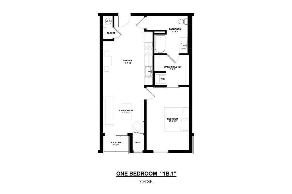 Modelo de apartamento: 1 Bed w/BalconyLlame para Precios1 Dormitorio, 1 Baño, 754 sq ftNo Disponible![]()