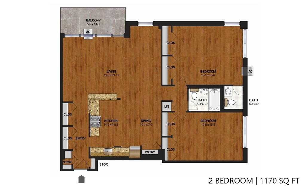 Modelo de apartamento: The Shores - Two Bedroom (E)$2,0172 Dormitorios, 1.5 Baños, 1170 sq ftDisponible AhoraLos planos son representaciones artísticas. Todas las dimensiones son aproximadas. El producto y las especificaciones reales pueden variar en tamaño o detalle. No todas las características están disponibles en cada vivienda en alquiler. Por favor, consulta con un representante para obtener más detalles.