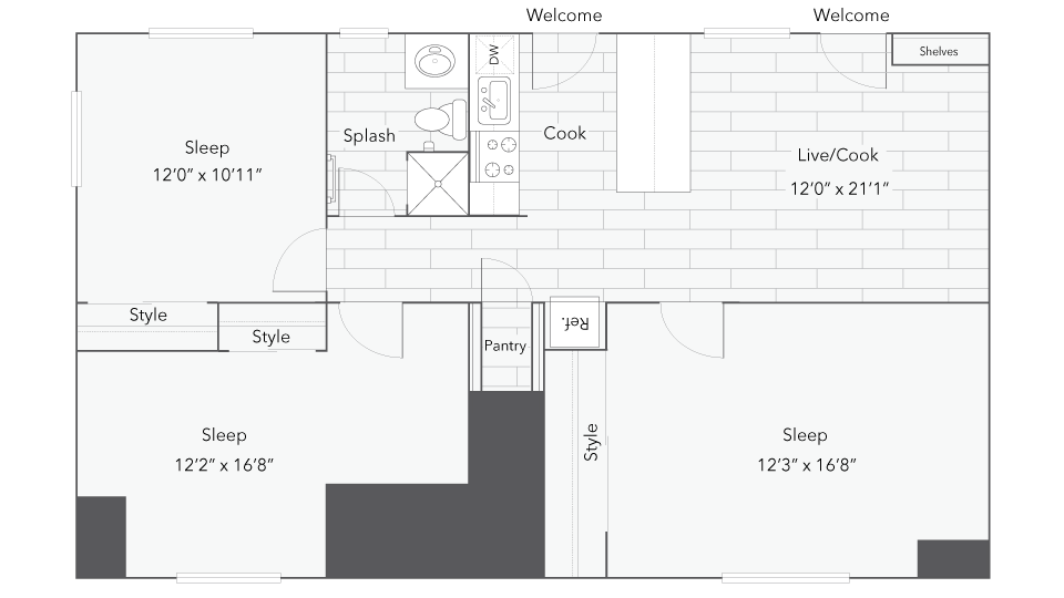 2 Dormitorios, 1 Baño, 1057 pies²Precio Mensual TotalDisponible July 15, 2026Galería del Modelo