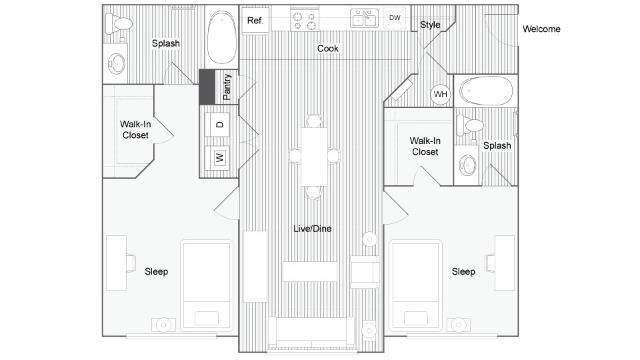 Modelo de apartamento: 2x2Desde $8642 Dormitorios, 2 Baños, 981 sq ftDisponible Ahora![]()