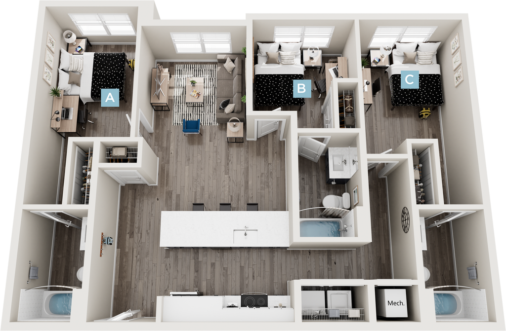 Modelo de apartamento: Cherry - 3x3$1,6303 Dormitorios, 3 Baños, 1191 sq ftDisponible AhoraCherry - 3x3 - Plano 1 Unidad de apartamento: Private BedroomModelo de apartamento: Cherry - 3x3$1,6303 Dormitorios, 3 Baños, 1191 sq ftDisponible AhoraCypress - Balcony - 3x3