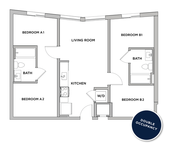 A1 - 1x1 - Plano 1 Unidad de apartamento: Standard Bedroom Shared Bathroom Double OccModelo de apartamento: A1 - 1x1$1,8501 Dormitorio, 1 Baño, 550 sq ftDisponible AhoraA2 - 1x1