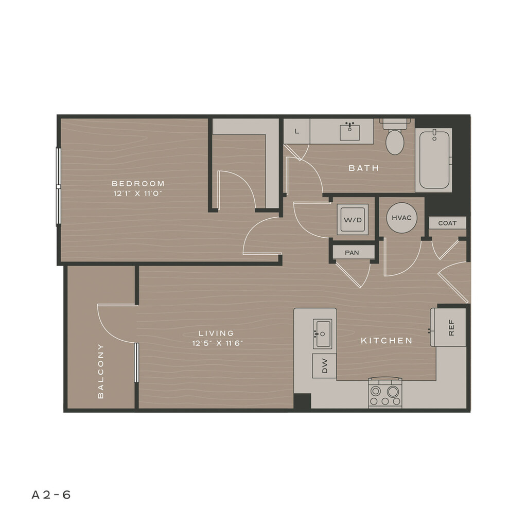 Modelo de apartamento: A2-4Desde $1,6351 Dormitorio, 1 Baño, 806 sq ftDisponible Ahora![]()