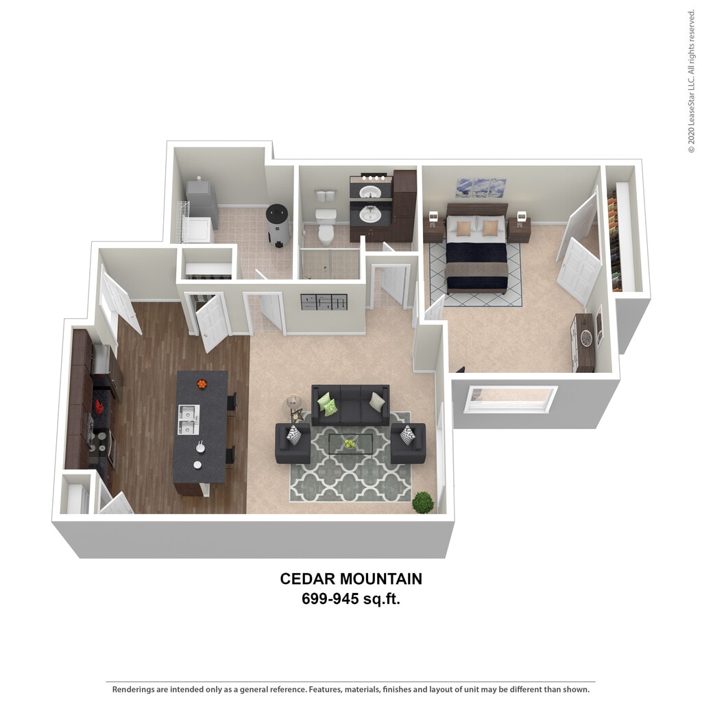 Modelo de apartamento: Cedar MountainLlame para Precios1 Dormitorio, 1 Baño, 699-945 sq ftNo Disponible![]()